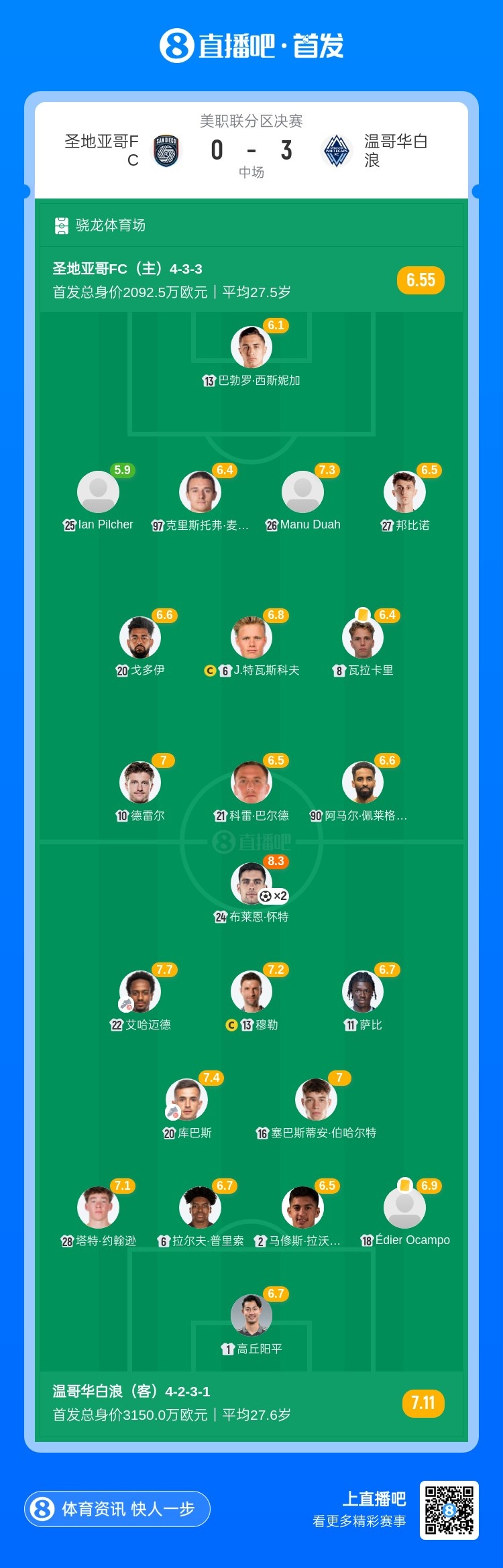 11月30日讯 北京时刻11月30日上昼10:00,好意思职联分区决赛,圣地亚哥FC镇守骁龙指令场对阵温哥华白浪。上半场,怀特推佛门,巴勃罗乌龙球,怀特双响。半场战罢,圣地亚哥FC暂0-3温哥华白浪。