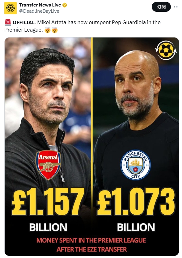 这笔转会敲定后,有媒体称阿尔特塔在英超的糟践仍是达到11.57亿镑,跨越了瓜迪奥拉(10.73亿镑),但这个报谈遭到德转打脸。
