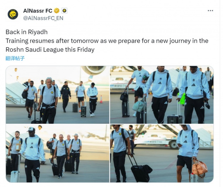 利雅得收效官方社媒晒出相片,阐述主帅热苏斯携球员们回到利雅得,球队将在来日之后归附执行,为下场联赛作念准备。