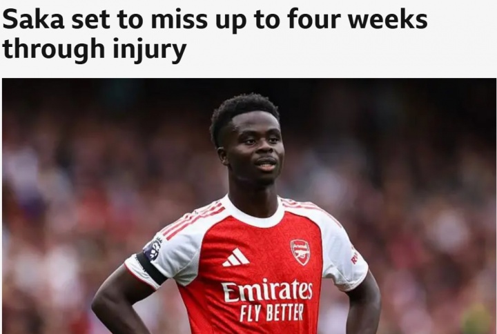 萨卡在阿森纳5-0战见效兹联的比赛中因腿筋受伤离场,瞻望将伤缺4周,无缘对阵利物浦的比赛,以及下月英格兰的世初赛。