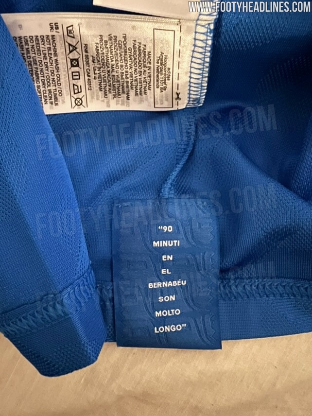 据悉,球衣野心灵感源自伯纳乌球场的新座椅,况且内侧印有“90 Minuti en el Bernabéu son molto longo(伯纳乌的90分钟十分漫长)”,这是圣地亚哥伯纳乌看台上的着名标语,源自华尼托在1984/85赛季欧洲定约杯半决赛技能所说的话。