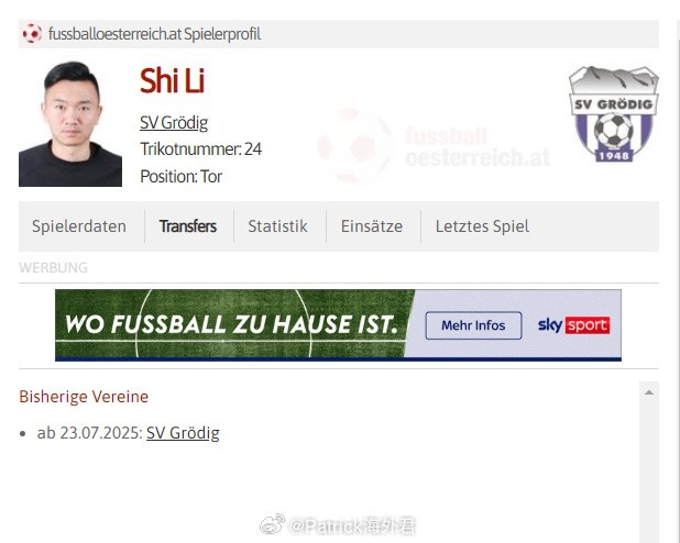 10月5日讯 据媒体东说念主“Patrick国外君”炫耀,前成皆蓉城门将李实加盟奥地利第4级别联赛俱乐部SV格勒迪希。