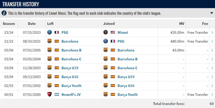 梅西事业糊口先后着力巴萨、巴黎以及迈阿密外洋三家俱乐部,两次转会梅西均是解放身离队,无转会费。在梅西的德转页面中,他的糊口历史转会费总数昭彰泄露为0。