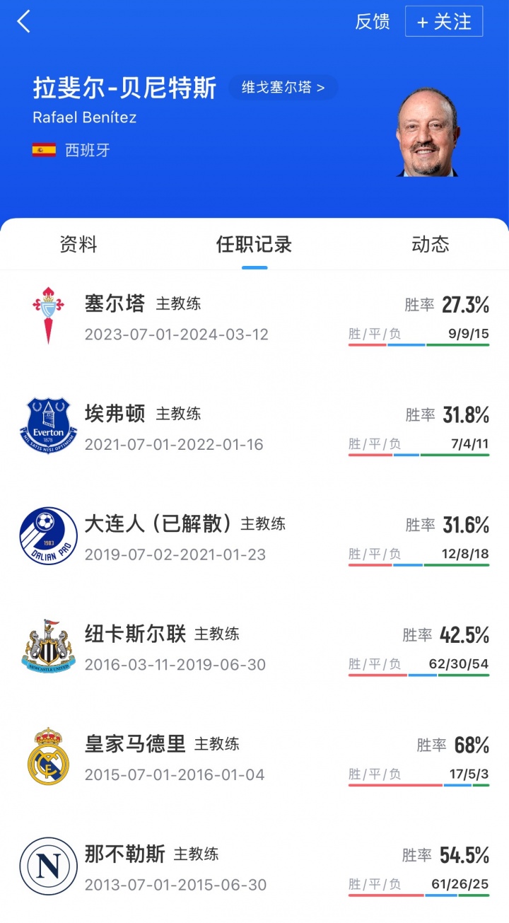 贝尼特斯现年65岁,在客岁3月份离开塞尔塔帅位后休闲于今。贝尼特斯此前曾抓教过利物浦、国米、切尔西、那不勒斯和皇马等朱门,荣誉等身,包括2次西甲冠军、1次欧冠冠军、2次欧联杯冠军和1次世俱杯冠军等。此外贝尼特斯还曾在2019年至2021年担任大连东谈主种植。