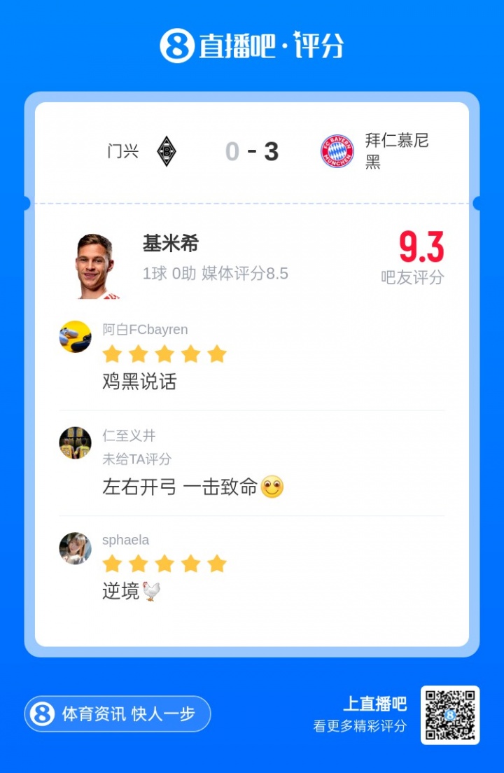 拜仁3-0门兴,基米希首开记载通达得胜之门