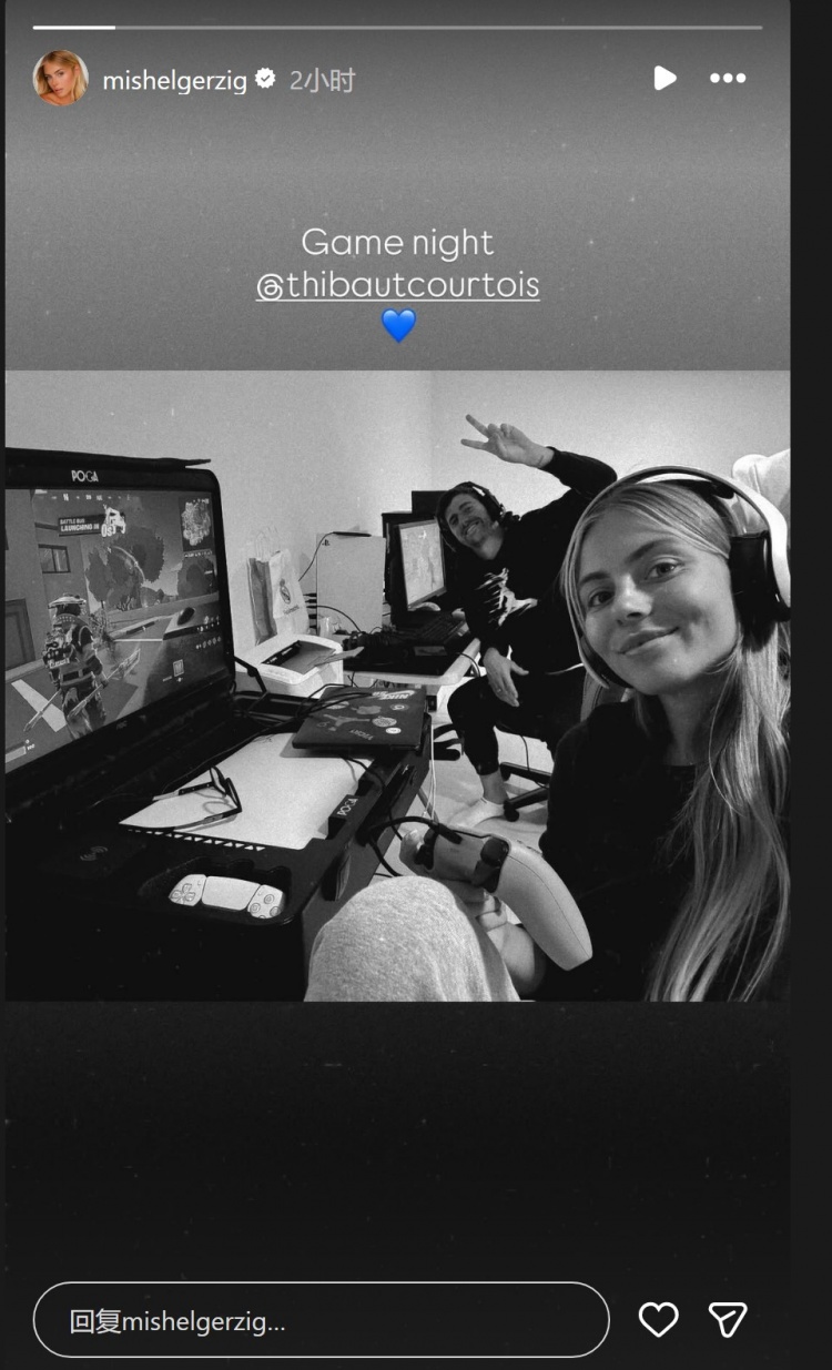 米歇尔·格兹格社媒晒照,她与库尔图瓦在家中联机打游戏,配文:“游戏之夜。”
