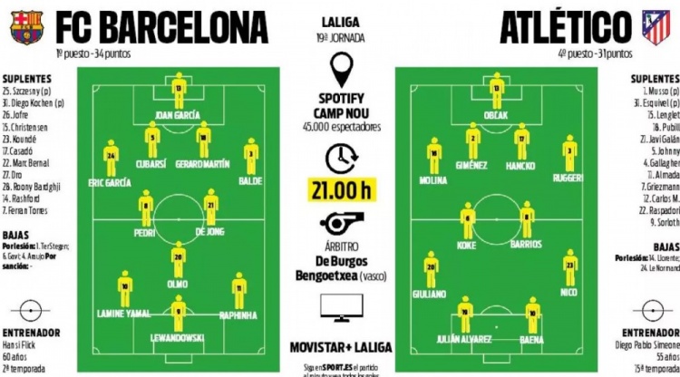 每体瞻望巴萨vs马竞首发:莱万对决阿尔瓦雷斯,马丁搭档库巴西