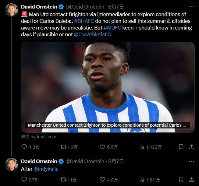 08月13日讯 8月7日,The Athletic名记奥恩斯坦爆出曼联问价巴莱巴的转会新闻后,暗示这一音问当先由博主indykaila(绿帽哥)爆料,激发外网热议,该条动态近2000万次不雅看。近日,奥恩斯坦在作客播客节目时,首度复兴了此事。