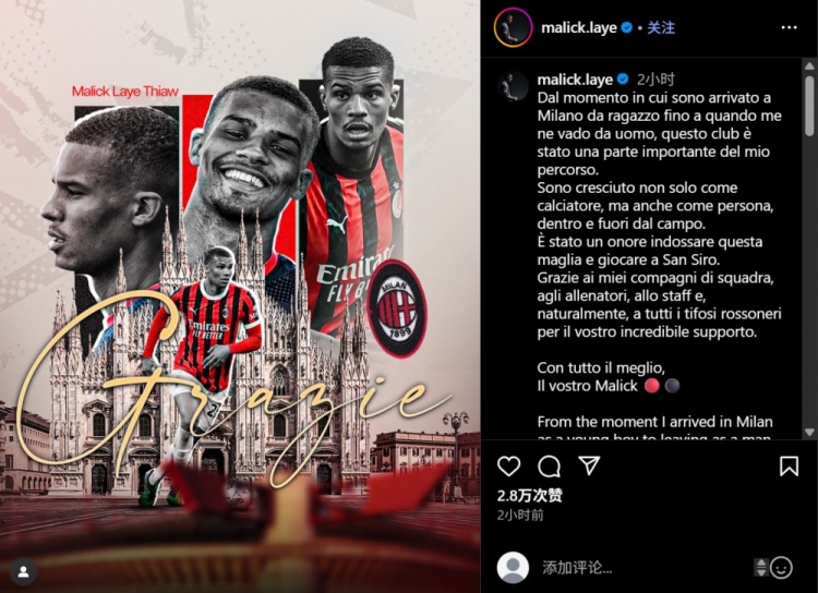 8月14日讯 夏窗佳夫从米兰转会纽卡,来去仍是官宣。这名后卫在个东说念主社媒发文,向米兰告别。