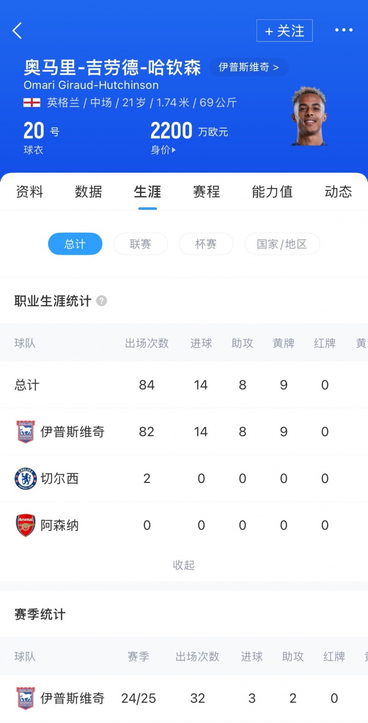 哈钦森现年21岁,英格兰中场,出自阿森纳青训。哈钦森在旧年以2350万欧元从切尔西转会伊普斯维奇,上赛季他各赛事为球队出场32次,孝敬3球2助。