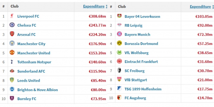 若是对比英超和德甲今夏转会窗的支拨不错发现,在英超转会窗支拨榜上排名第10的伯恩利依然破耗7395万欧,这个数字以致不错在德甲的支拨榜上排进前三。