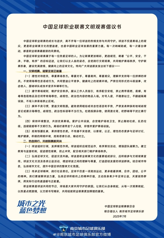 南京城市足球俱乐部时髦不雅赛倡议书
