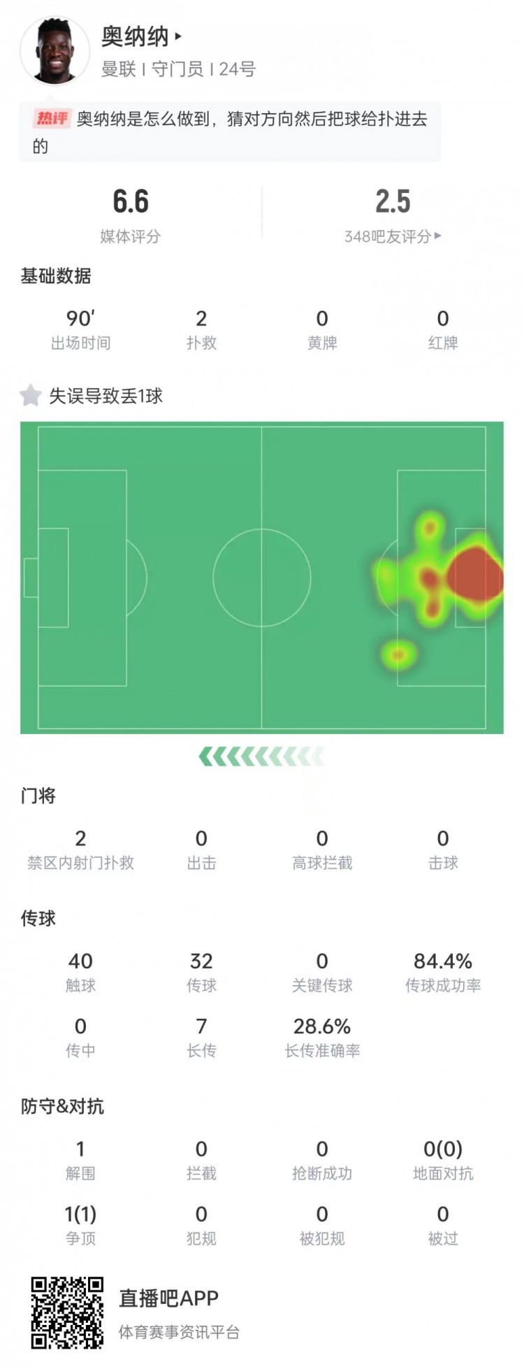 奥纳纳本场数据:作念出2次扑救&出击失实导致丢球,获评6.6分