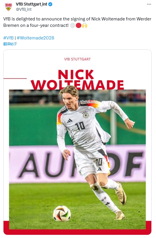 8月29日讯 斯图加特时尚沃尔特马德行将加盟英超纽卡,据悉转会费可能高达9000万欧。