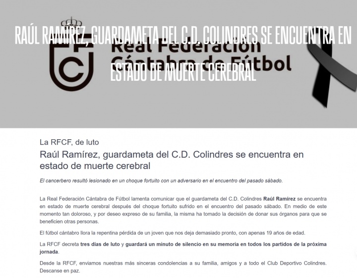对科林德雷斯俱乐部19岁门将劳尔-拉米雷斯的衰一火深表悲伤。