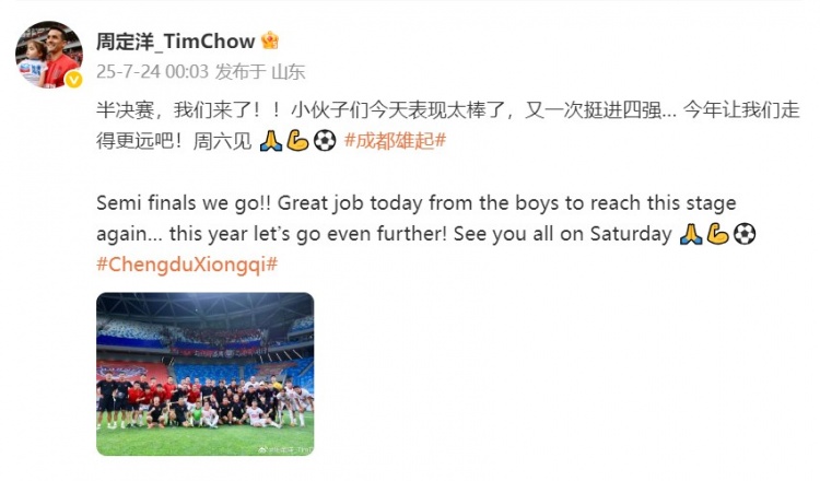 周定洋在个东谈主微博中写谈:半决赛,咱们来了!!小伙子们今天发扬太棒了,又一次挺进四强… 本年让咱们走得更远吧!周六见 🙏💪⚽️