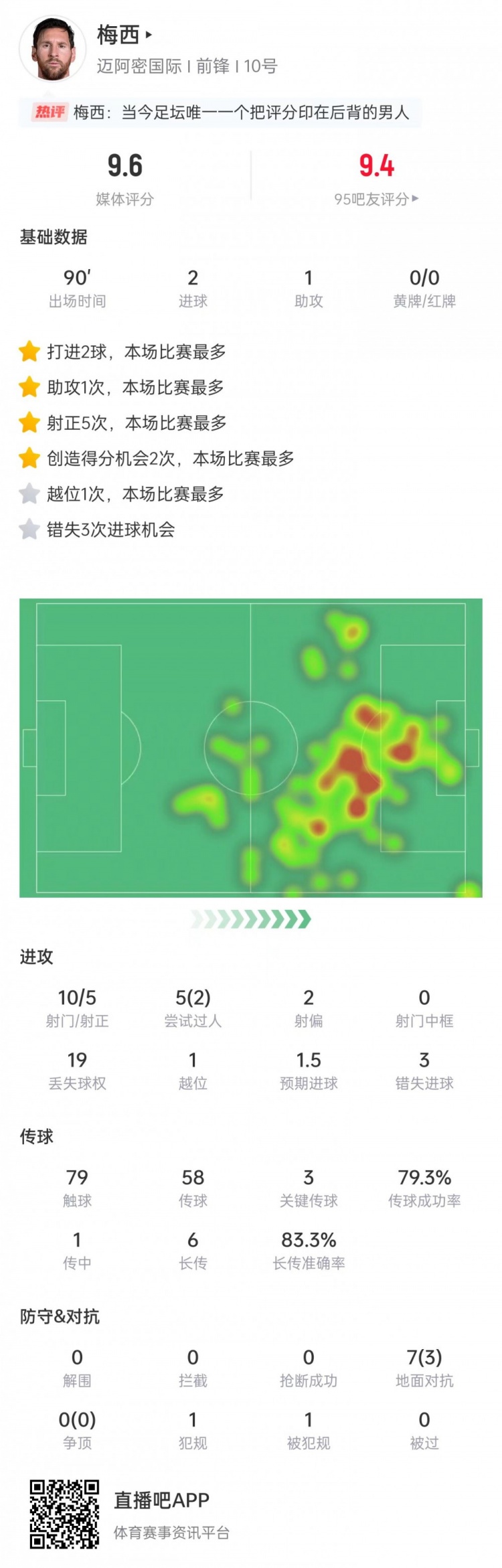 2射1传!梅西本场数据:10次射门5次射正,错失3次契机,评分9.6