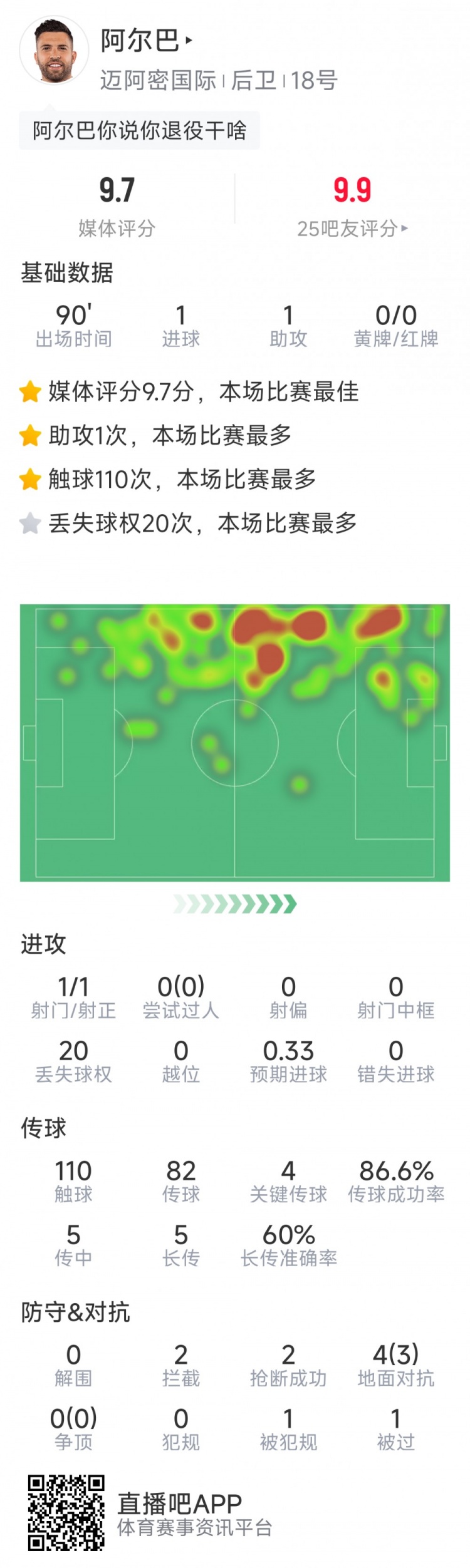 退役早了点?阿尔巴本场数据:传射立功,4次关节传球,评分9.7分