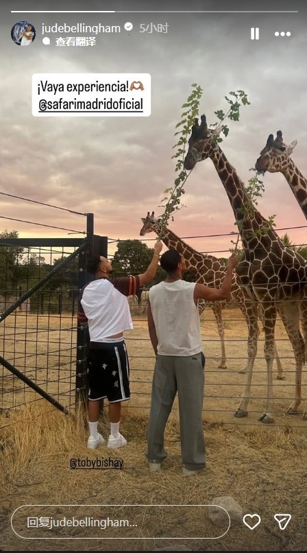 繁难自满时光,皇马中场贝林厄姆社媒晒和长颈鹿互动照