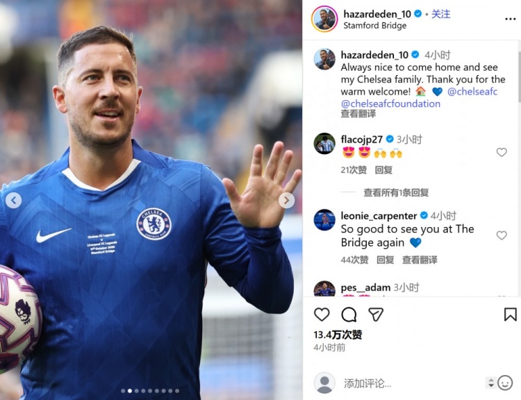 阿扎尔写说念:回家并见到切尔西大家庭的成员老是很欢快,感谢你们的历害接待!