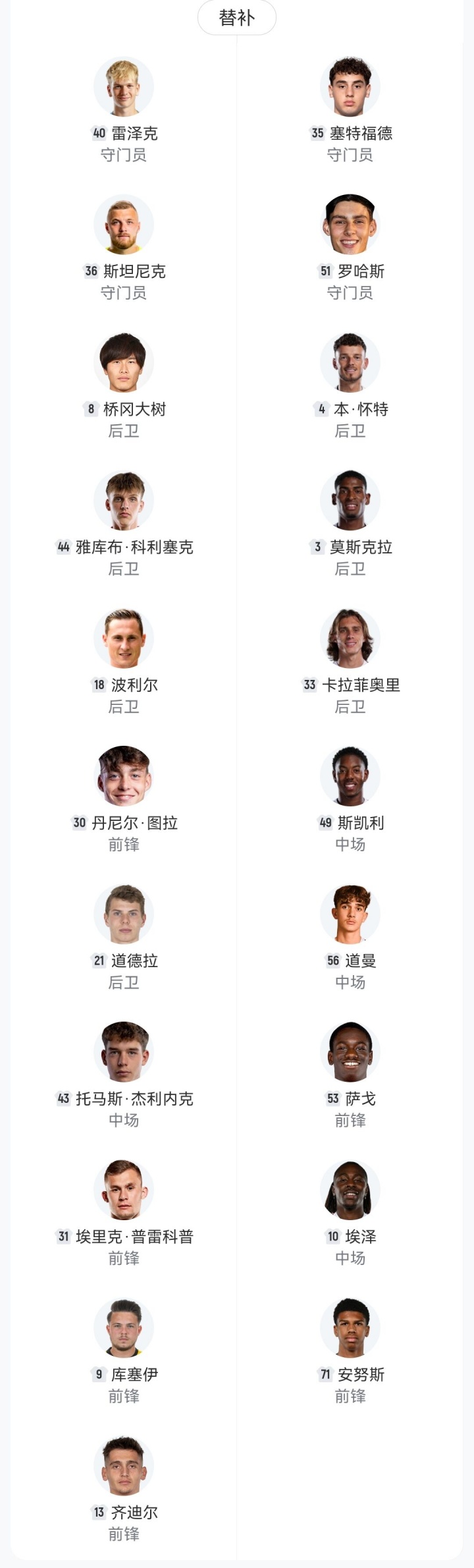 阿森纳当今正碰到伤病潮,一线队锋线6东谈主仅剩特罗萨德、萨卡两东谈主健康,今晚沿途首发;中场梅里诺再度客串中锋,队长厄德高也因伤缺阵;但好讯息是防地“八大金刚”当今均健康无虞,为枪手保证了防地的深度。