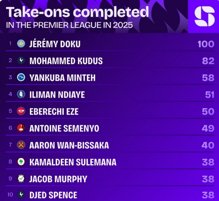 11月10日讯 英超第11轮比赛,多库完成7次过东说念主,打进1球,匡助曼城3-0打败利物浦。据Squawka统计,多库是2025年首位英超告成过东说念主达到100次的球员。