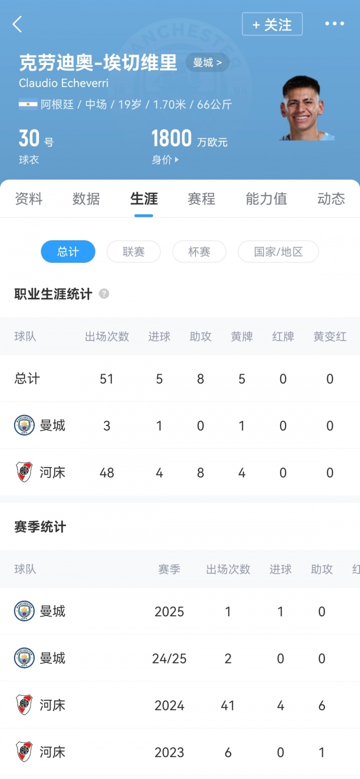 19岁的埃切维里冬窗追究加入曼城气势,现在仅为曼城出场过3次,孝敬1粒进球,现身价1800万欧。