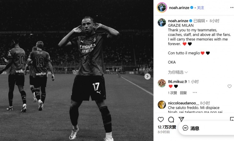 奥卡福写谈:“谢谢米兰!感谢我的队友、提醒、职责主谈主员,尤其感谢球迷们。我将永恒宝贵这些回忆。❤️🖤”