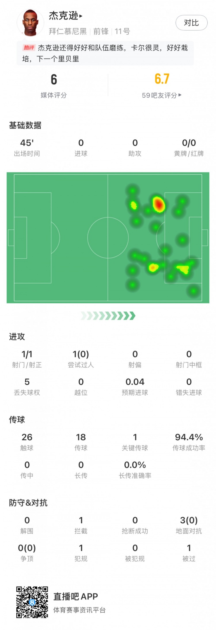 9月14日讯 德甲第3轮,拜仁主场5-0打败汉堡,杰克逊迎来拜仁生存首秀,共踢了半场比赛,球员本场数据如下: