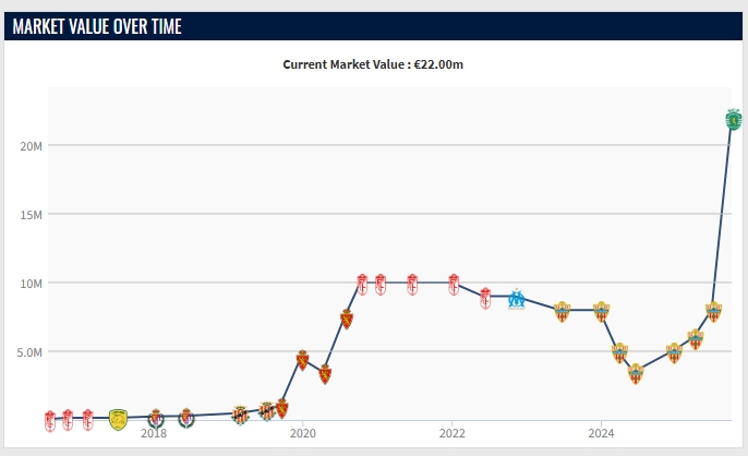 此前球员身价为800万欧,如今身价暴涨了1400万欧,涨至2200万欧。