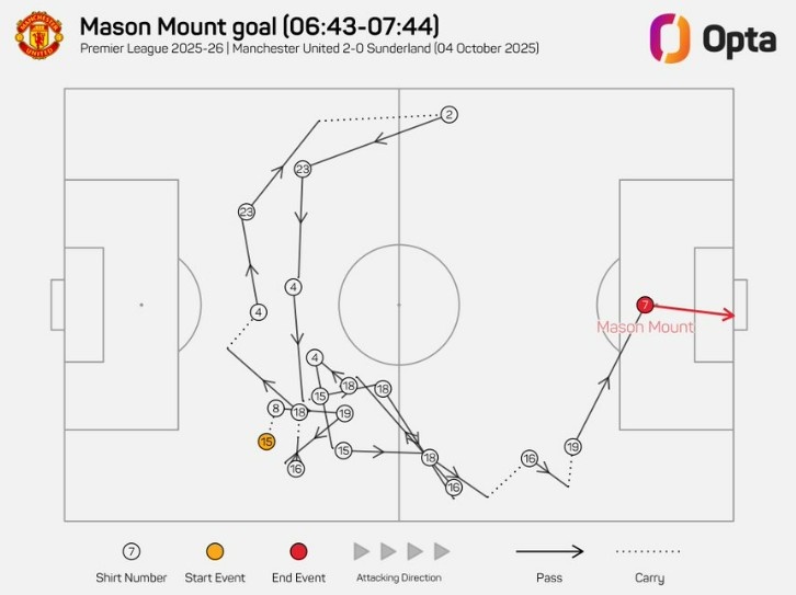 据统计,芒特进球前流程18次传球,这是本赛季英超进球中最多,而曼联上一次进球前有如斯多传球还在2023年9月(B费进球)。