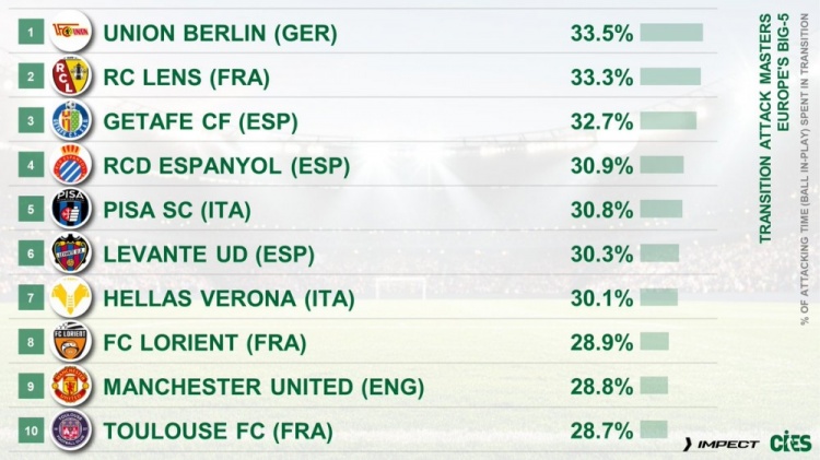 11月4日讯 CIES统计了本赛季五大联赛球队攻防养息阶段占据蹙迫总时辰的比例,比肩出榜单,柏林筹备由守转攻占比33.5%居首,朗斯33.3%、赫塔费32.7%二三位。