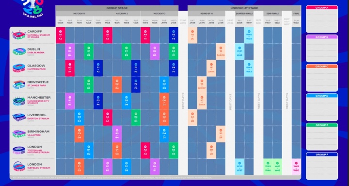 开幕战定于2028年6月9日(周五)在卡迪夫国度领会场举行,为A组小组赛。