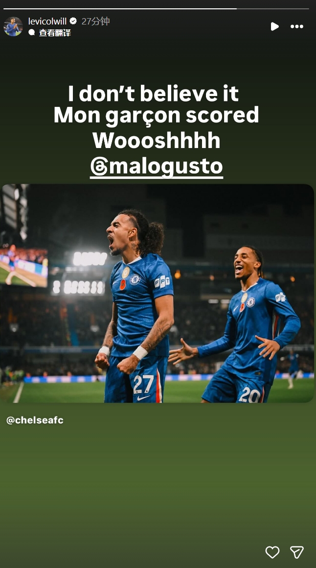 他的队友科尔维尔也通过社媒晒照簸弄:“我不坚信!我的男孩进球了,嗖!@古斯托”。