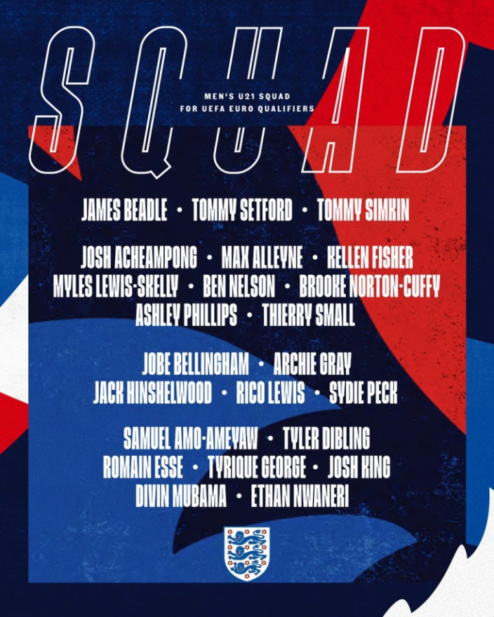 直播吧3月20日讯英格兰U21国家队公布了新一期球员名单,英格兰U21将在U21欧洲杯预选赛中对阵安道尔U21、摩尔多瓦U21。