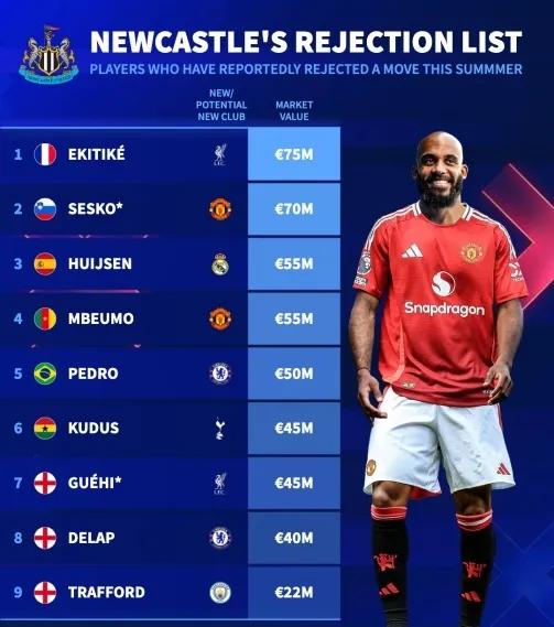 纽卡在今夏转会窗口遇到了前所未有的逆境和痛楚,多位指标球员在报价更高、工资待遇更好的情况下断绝加盟,转而采纳其他朱门球队。德转统计了断绝纽卡的9名球员非凡行止: