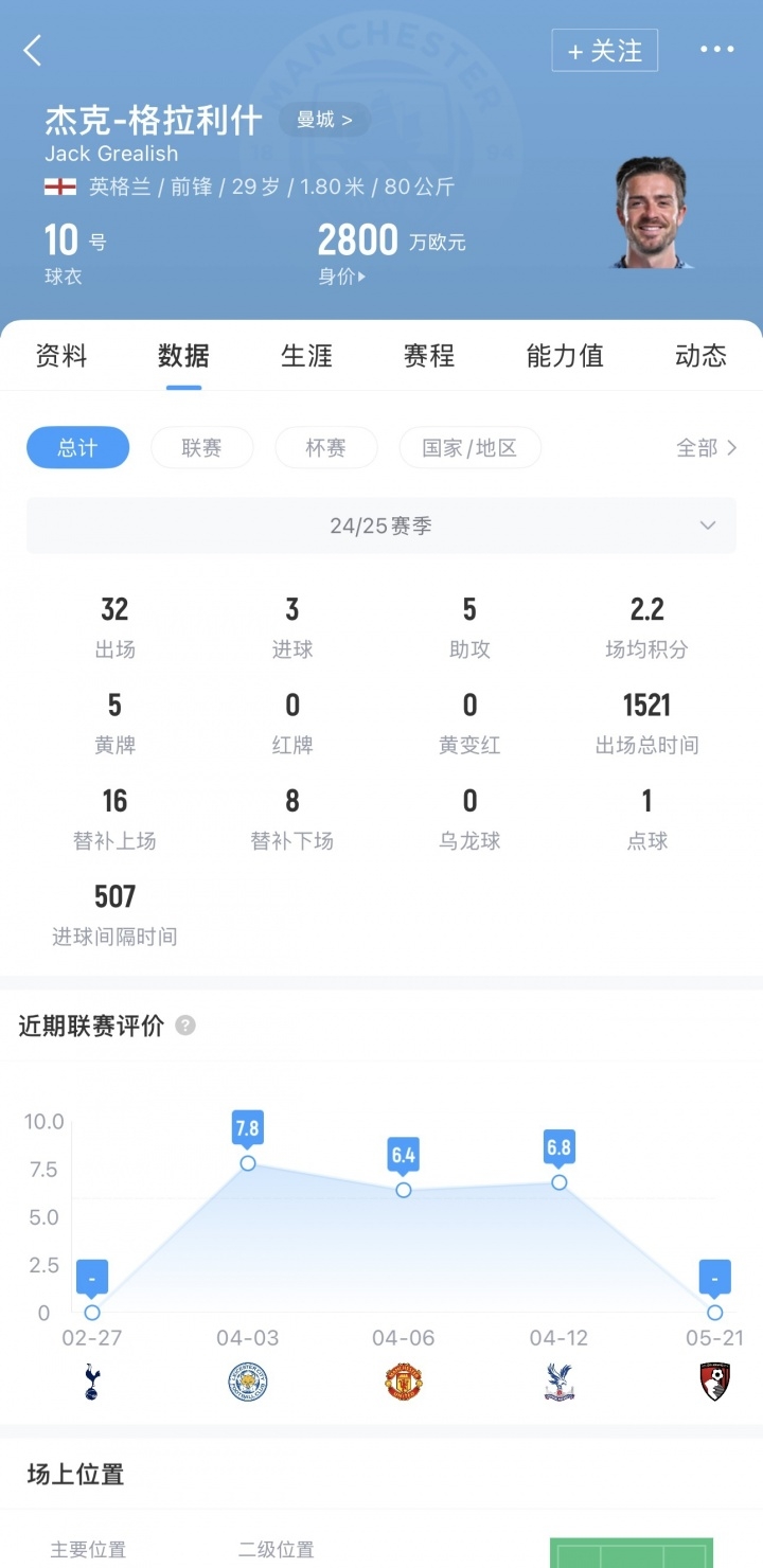 格拉利什通盘这个词2024/25赛季只在英超首发7次,他也莫得随队过问上个月的世俱杯比赛。截止当今球员共为曼城出场157次打入17球23助攻。