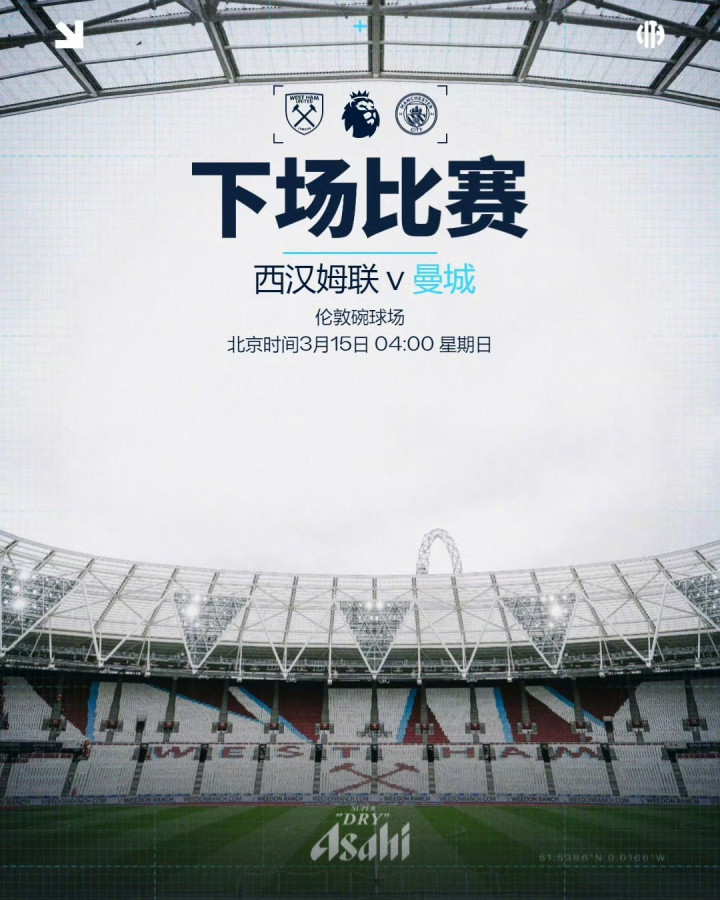 西汉姆联在新主场作战 伦敦碗9次英超迎战曼城不胜(2平7负),与迎战布莱顿的不胜场次并列最多(7平2负)。