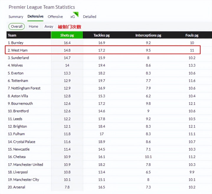本赛季西汉姆联在英超场均被射球 次数达到14.8次,只比职业联赛 排名倒数第二的伯恩利少,比其他球队都要多。相比之下,曼城场均被射球 10.1次,排名英超第二少。