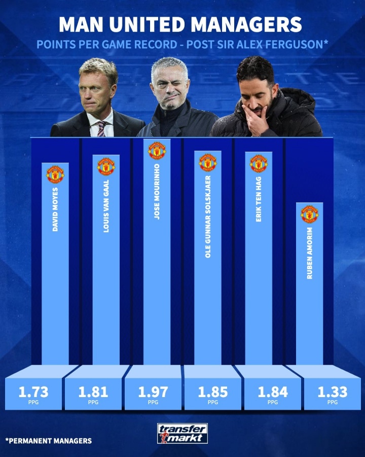 据此前德转统计,穆里尼奥是后弗格森期间场均得分最高的曼联主帅,他以场均1.97分位列第一,而现任主帅阿莫林则以1.33分垫底。