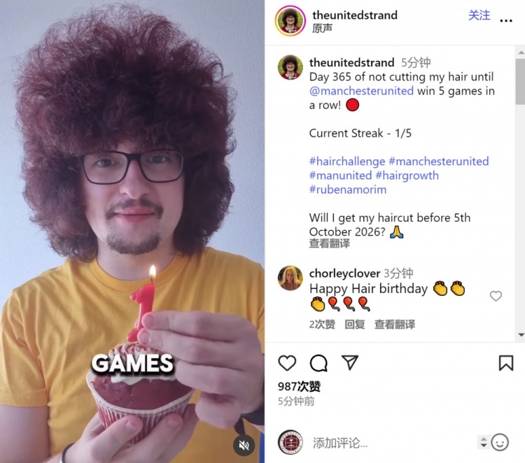 蓄发哥社媒晒出顾忌蓄发一周年视频,配文:“不剪头发直到曼联5连胜,第365天,面前连胜状况——1/5。”