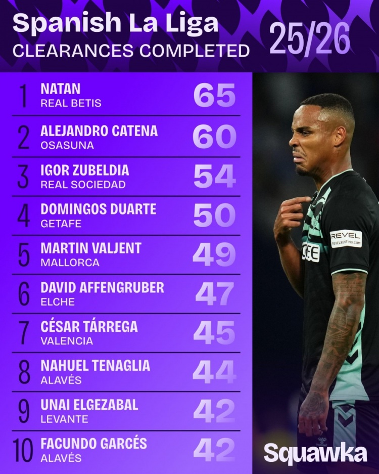 10月7日讯 日前,Squawka统计了本赛季西甲突围次数名次,贝蒂斯后卫纳坦65次居首,祖贝迪亚54秩序三。