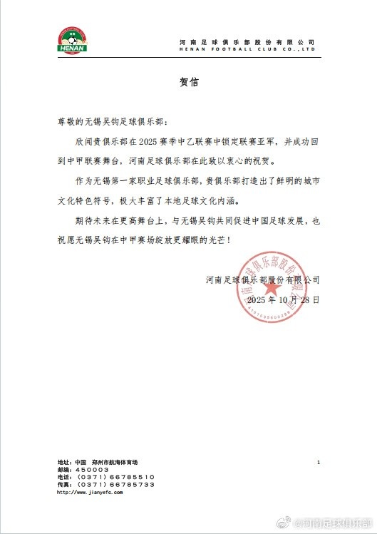欣闻无锡吴钩俱乐部在2025赛季中乙联赛中锁定联赛亚军,并收效回到中甲联赛舞台,河南足球俱乐部在此致以诚意的道喜。