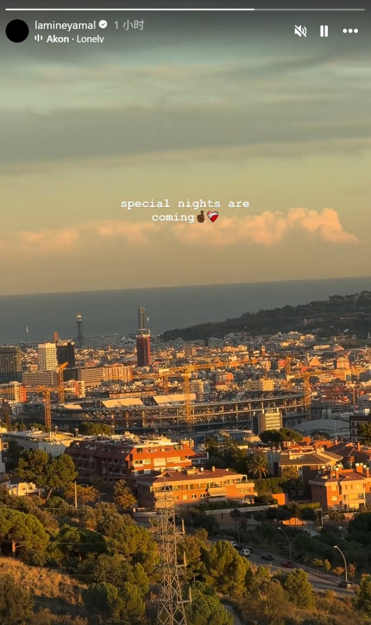 亚马尔社媒晒夕阳下的诺坎普球场:一个独特的夜晚行将到来
