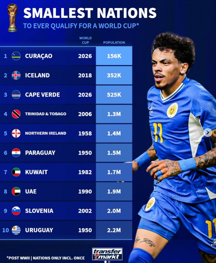 11月20日讯 世初赛现时仅剩多个附加赛限额待定,库拉索以15.6万东谈主成为二战之后晋级寰宇杯的东谈主口最少国度,《转会市集》也统计了二战之后晋级寰宇杯东谈主口最少的国度前十。