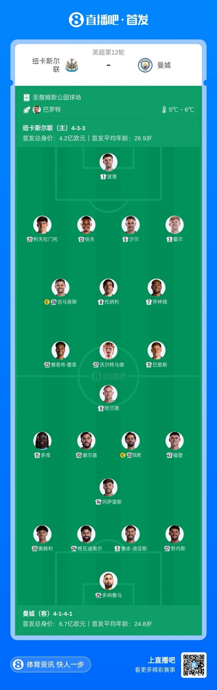 曼城vs纽卡首发:哈兰德PK沃尔特马德!谢尔基、多库、福登先发