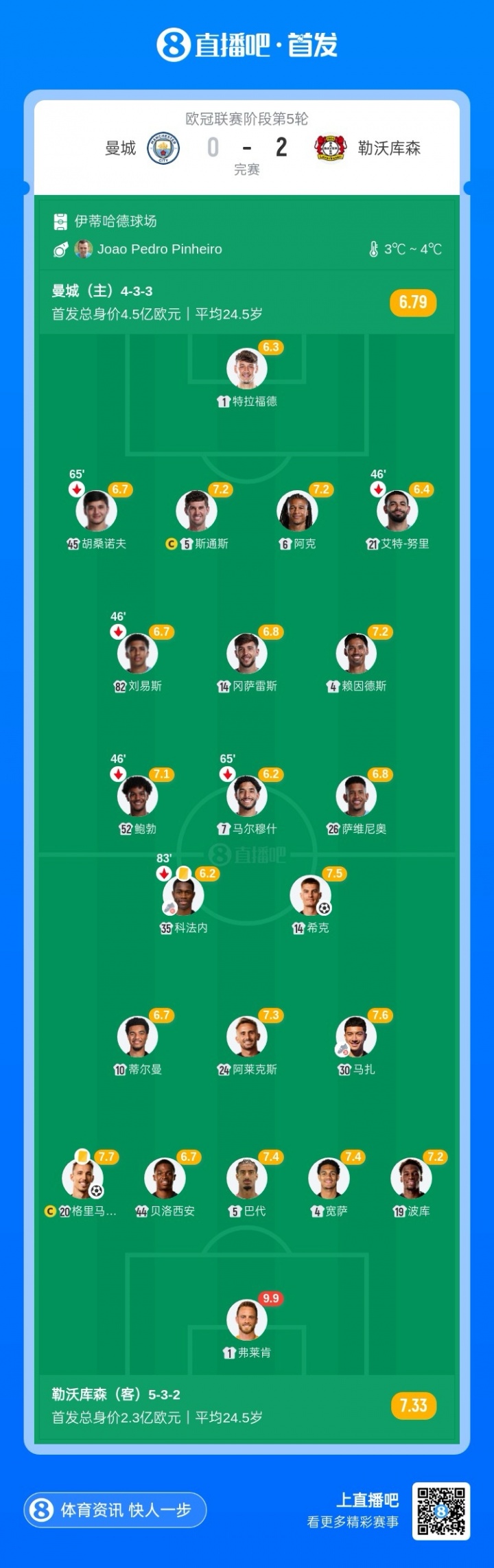 本场曼城大幅瓜代出战,首发11东说念主中仅有冈萨雷斯是成例首发,其余10东说念主均为成例替补。