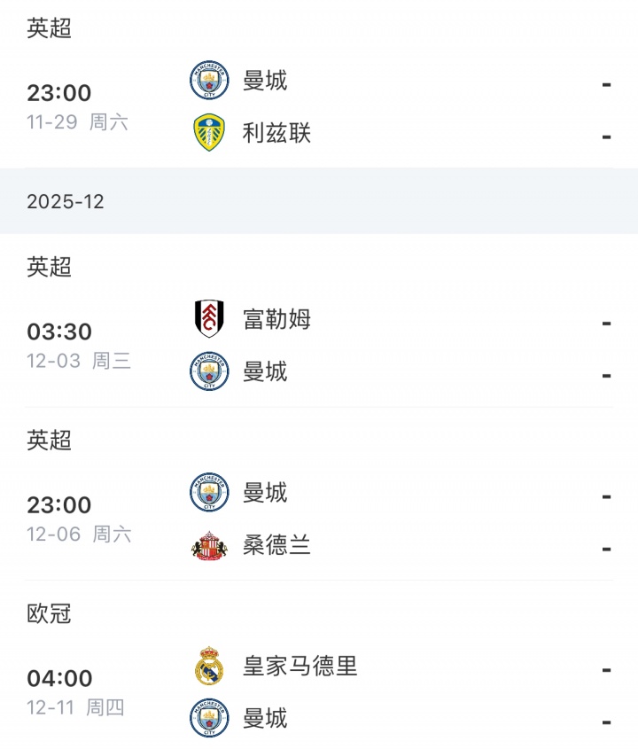 曼城之后3场比赛要在联赛先背濒临利兹联、富勒姆和桑德兰,然后鄙人一轮欧冠濒临皇马。