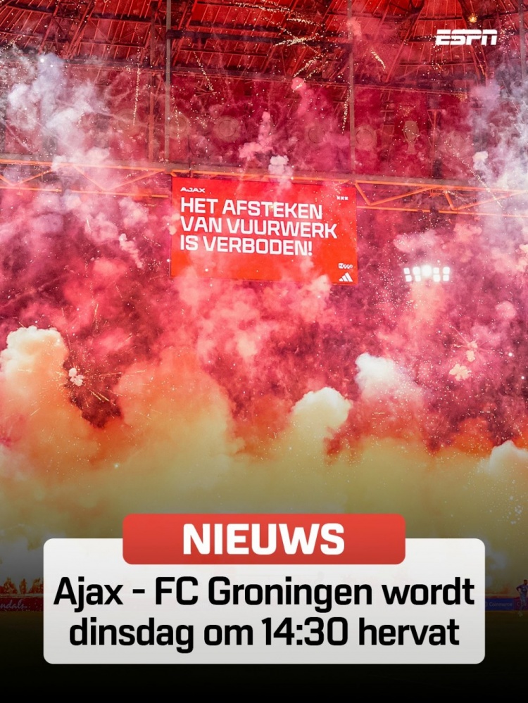 12月1日讯 阿贾克斯vs格罗宁根的荷甲联赛,因球迷燃放火食而中断并因此取消。阿贾克斯俱乐部和荷兰足协也更新了信息,通知补赛将于北京时分周二晚上21:30闭门举行。