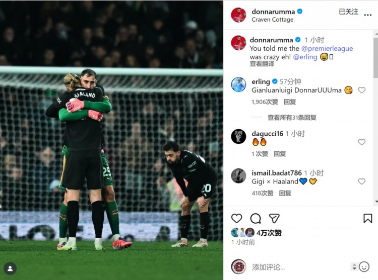 曼城门将多纳鲁马社媒晒出与哈兰德拥抱的像片,配文:“你早就告诉过我英超很荒诞,是吧!😅”